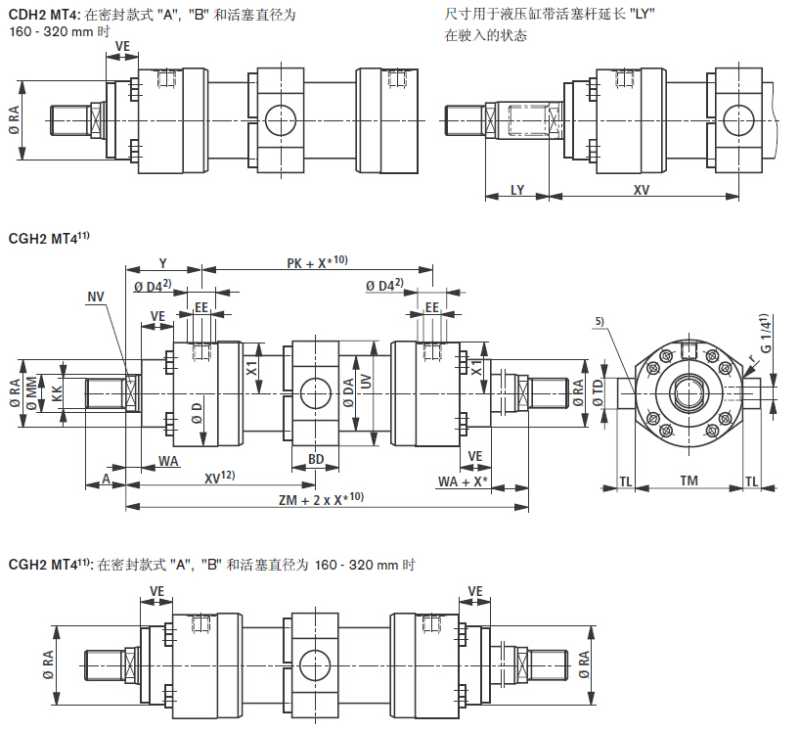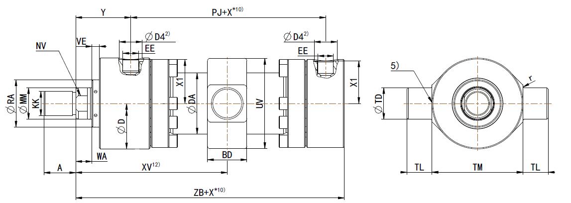 CDH2系列液壓缸中間鉸軸安裝方式。液壓缸的這種安裝方式允許油缸繞鉸軸旋轉(zhuǎn),但不允許側(cè)向擺動。此方式可做等速油缸(雙出桿油缸) 。 特別提醒:XV尺寸必須由客戶指定。