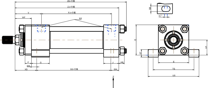 HMI/HMD重載拉桿油缸橫向腳座安裝方式 代號(hào):C 符合標(biāo)準(zhǔn):ISO 6020/2 DIN 24554 (同PARKER HMI/HMD系列油缸;力士樂CDT3系列油缸)