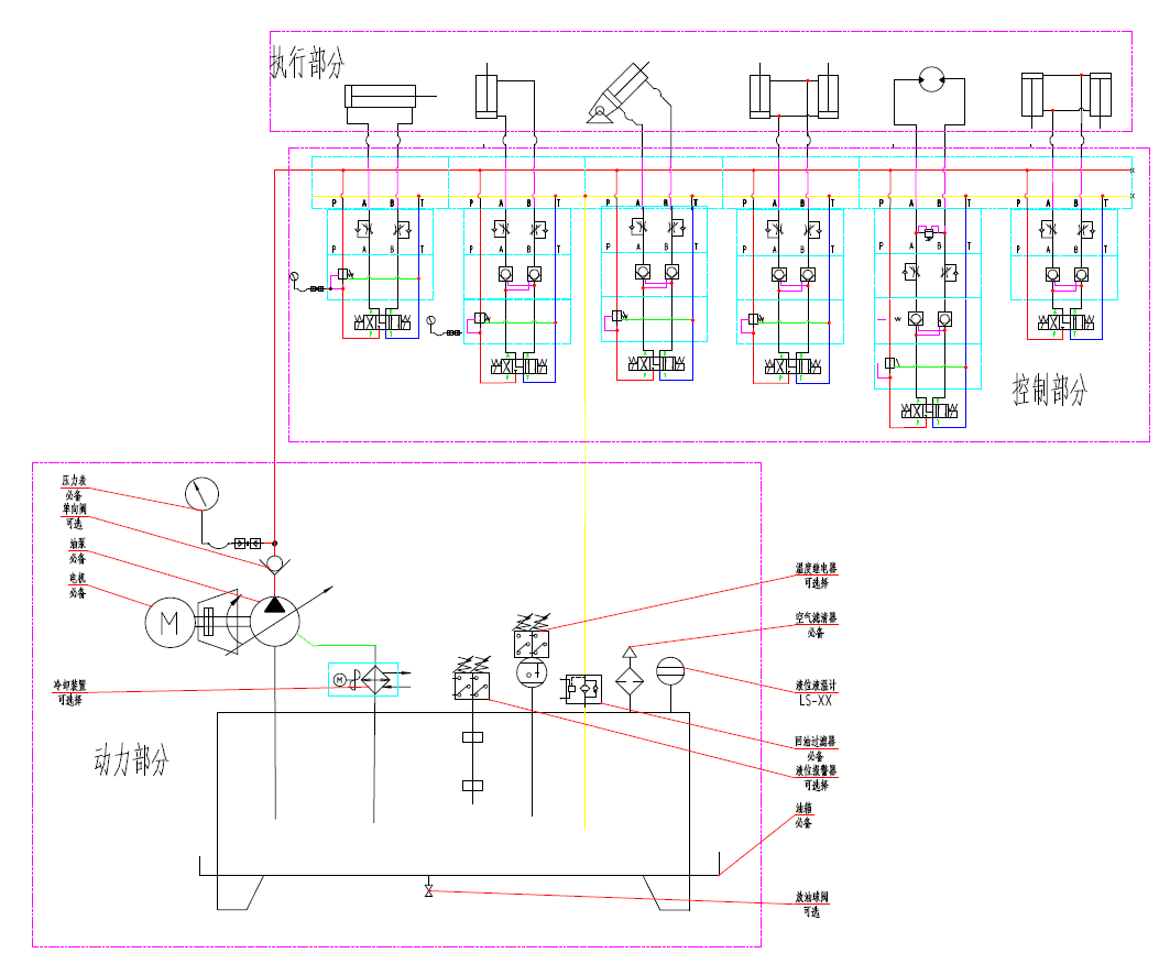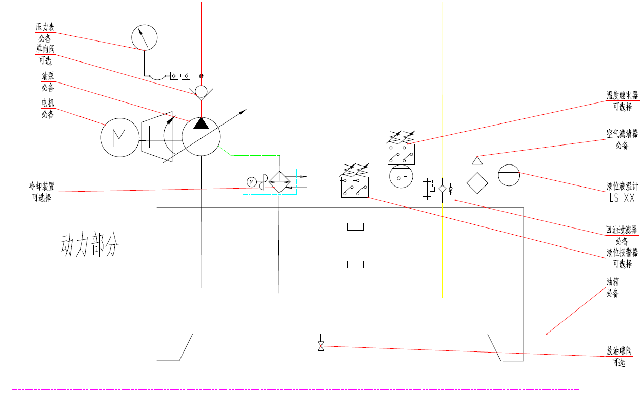 以下是一個低壓液壓系統(tǒng)原理圖的總圖。由圖可看出,液壓系統(tǒng)的三個組成部分。執(zhí)行部分,控制部分,動力部分。執(zhí)行部分和控制部分我們會有別的內(nèi)容闡述,這里不去多講。這里主要以動力部分-低壓液壓系統(tǒng)的油源做主要說明。