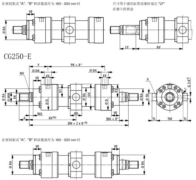 CD250系列高壓油缸中間鉸軸安裝方式。液壓缸的這種安裝方式允許油缸繞鉸軸旋轉(zhuǎn),但不允許側(cè)向擺動。此方式可做等速油缸(雙出桿油缸) 。 特別提醒:XV尺寸必須由客戶指定。