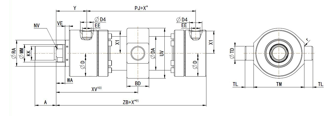 CDH1系列液壓缸中間鉸軸安裝方式。重載油缸缸的這種安裝方式允許油缸繞鉸軸旋轉(zhuǎn),但不允許側(cè)向擺動(dòng)。此方式可做等速油缸(雙出桿油缸) 。此系列重載油缸主要用作冶金油缸,高壓油缸。
